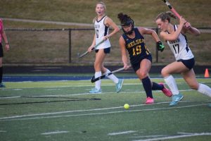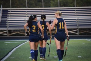 The middle school field hockey team rushes off the field in front of the high school team grinning ear to ear in support for one another