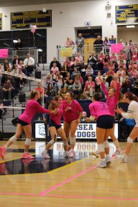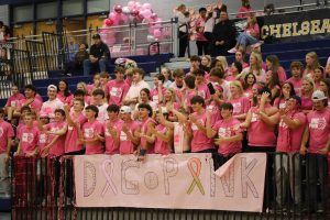 Chelsea Student section gesturing the scoreboard to Dexters student section across the gym