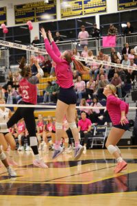 Sophomore Phia Stanavich lined up to spike over the net with a good set from senior Lexi Cummer